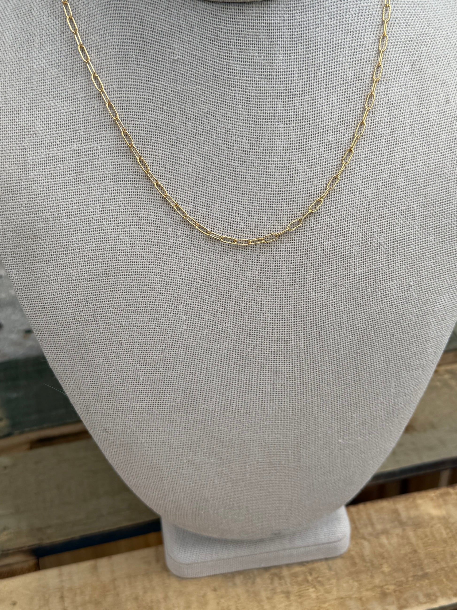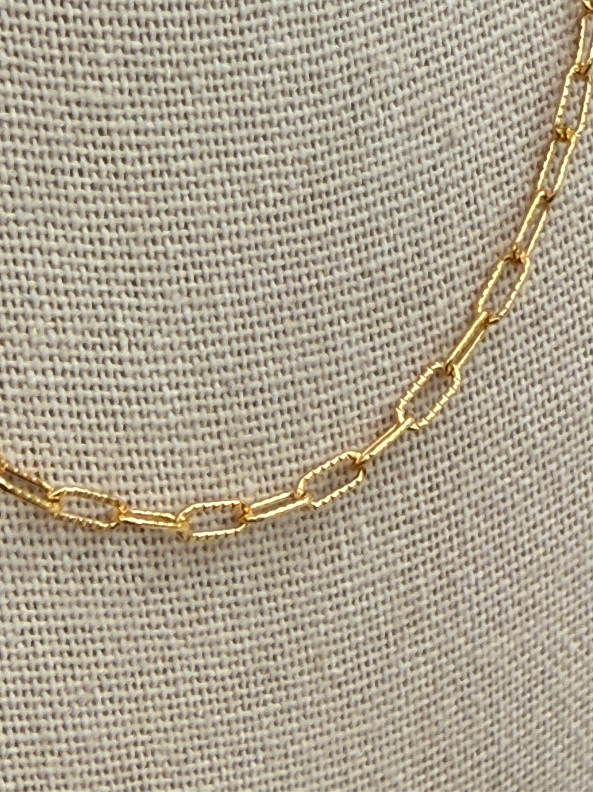 Our 12” 14K gold filled layering link chains are designed to connect seamlessly to the top two holes of your base necklace, creating a layered look that sits beautifully above it. This chain is made to work exclusively with our patented base necklace allowing you to swap out layering chains for different styles without buying a whole new necklace. The patented design is not anti twist but it does greatly reduce twisting when layering