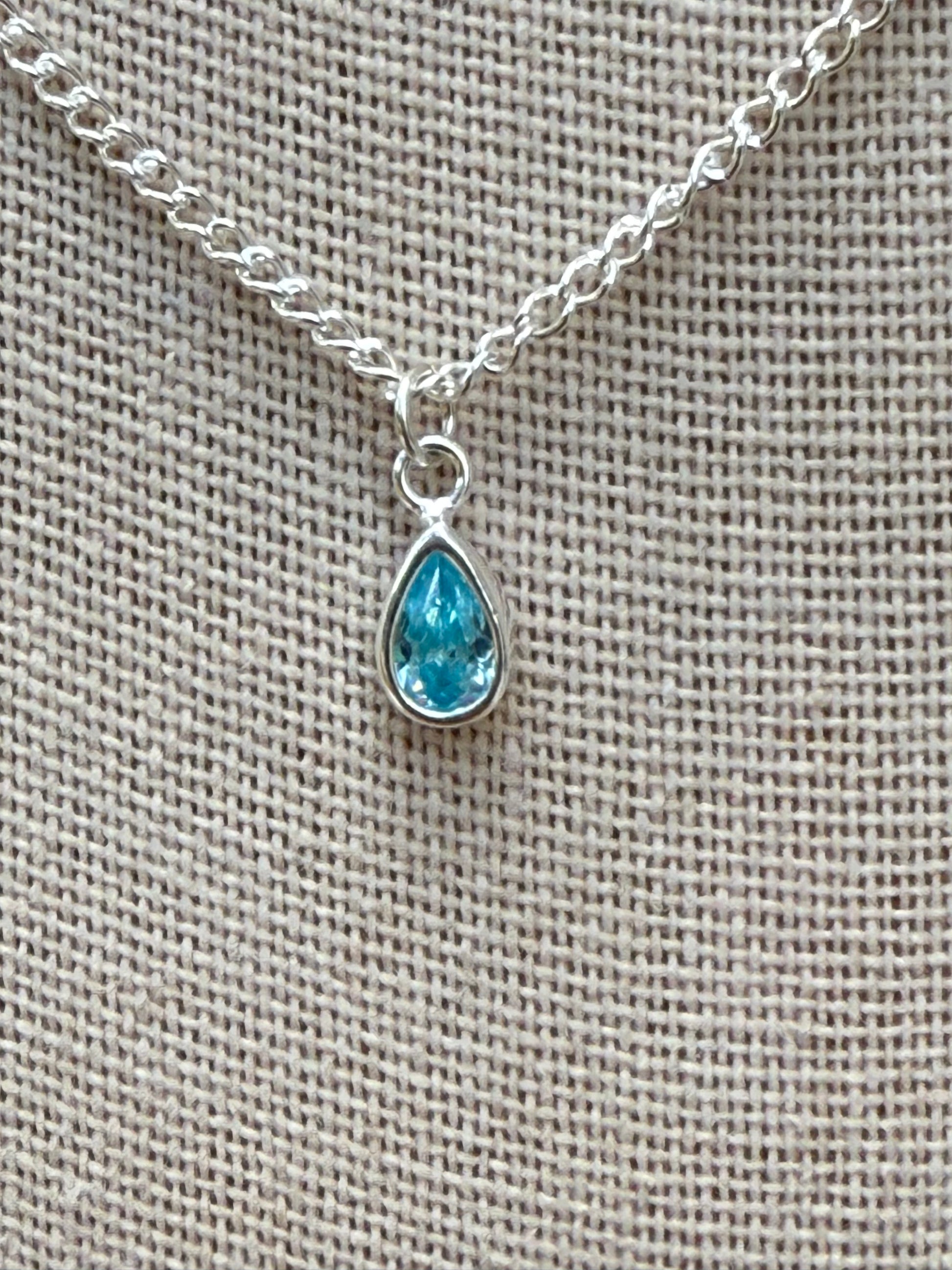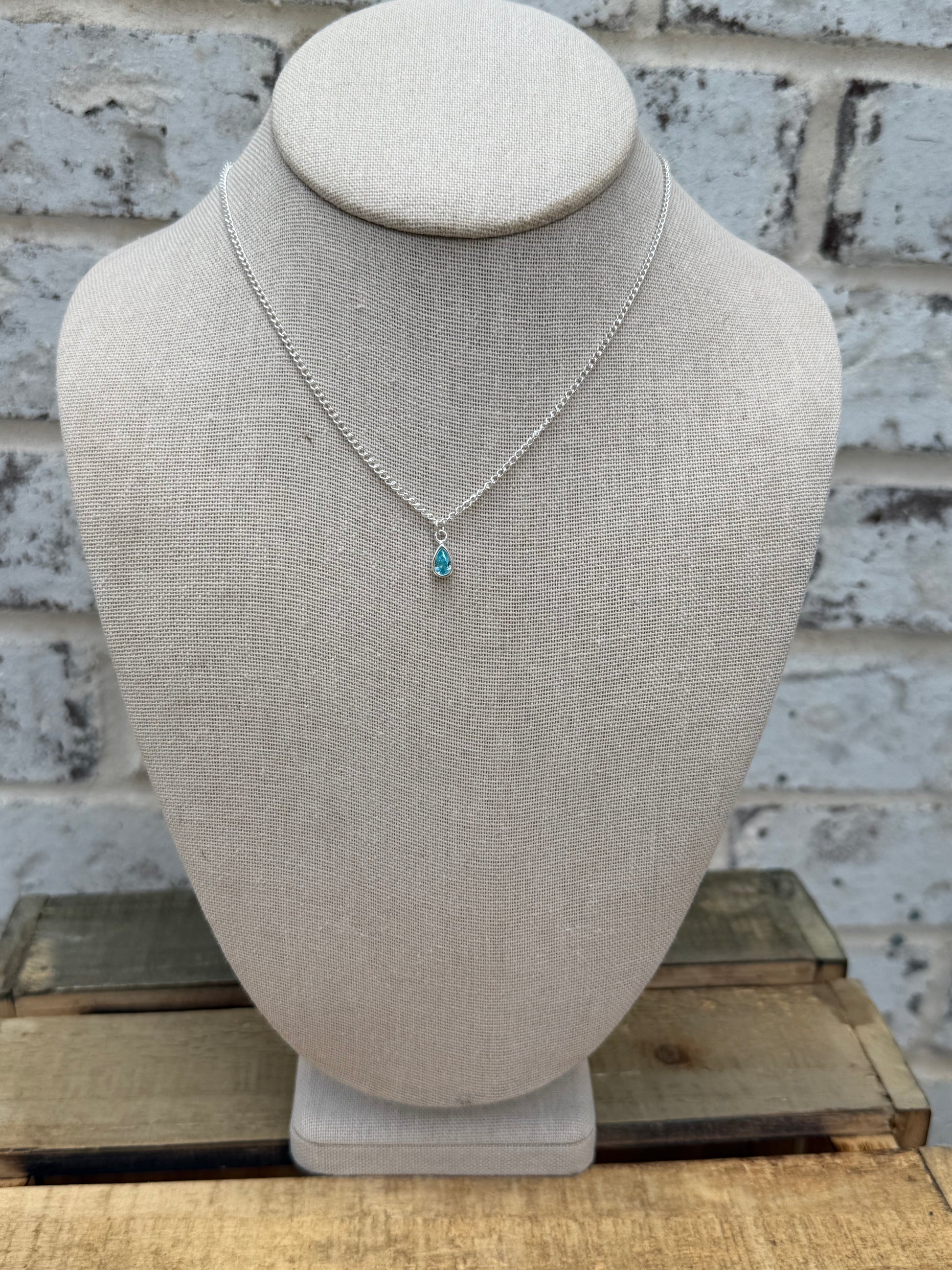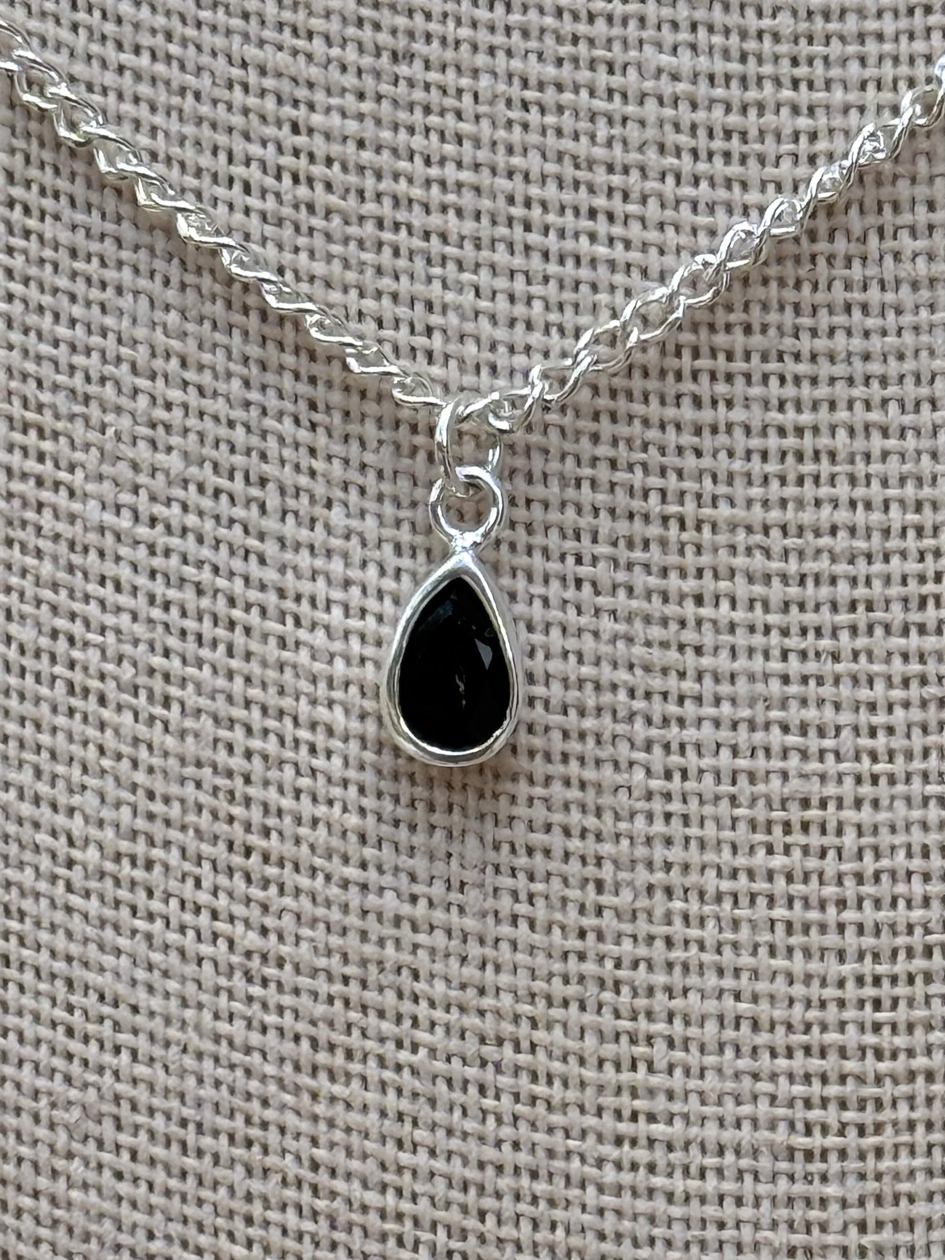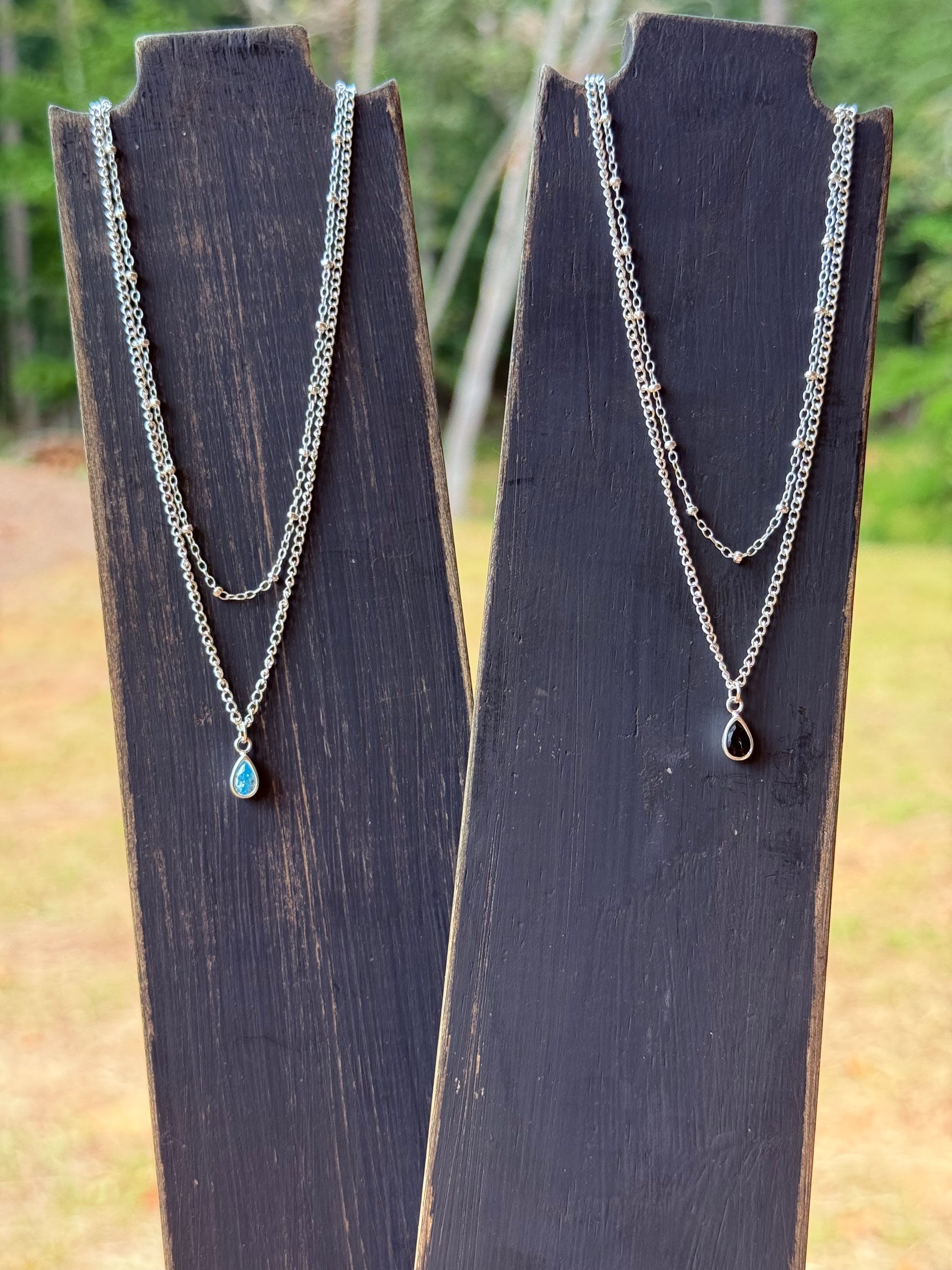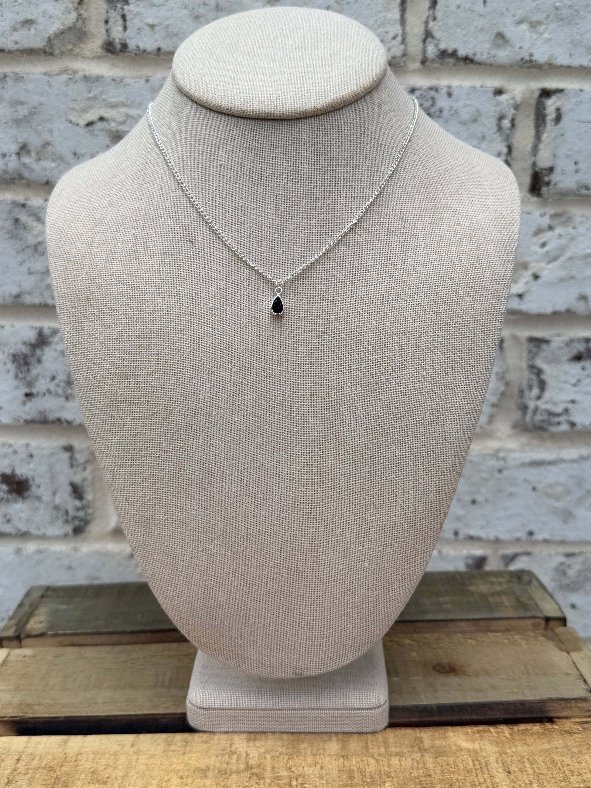 The base is a 1.7mm sterling silver curb chain, 16” in length with a 2” extender for the perfect fit. Your choice of black onyx or aquamarine. Each stone is set in sterling silver, adding a touch of timeless beauty.